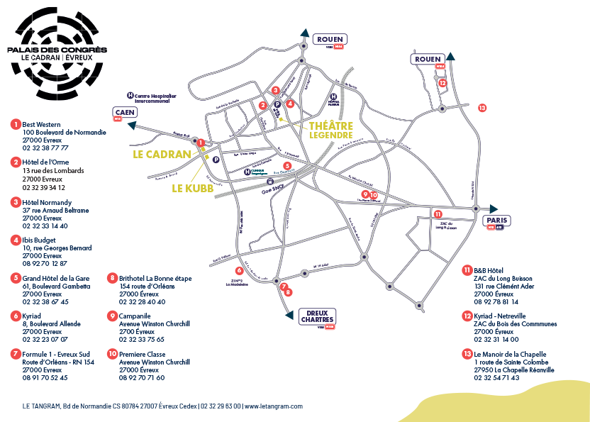 Le Cadran et le Kubb sont à 10 minutes et le Théâtre Legendre à 15 minutes à pied de la gare SNCF d'Évreux